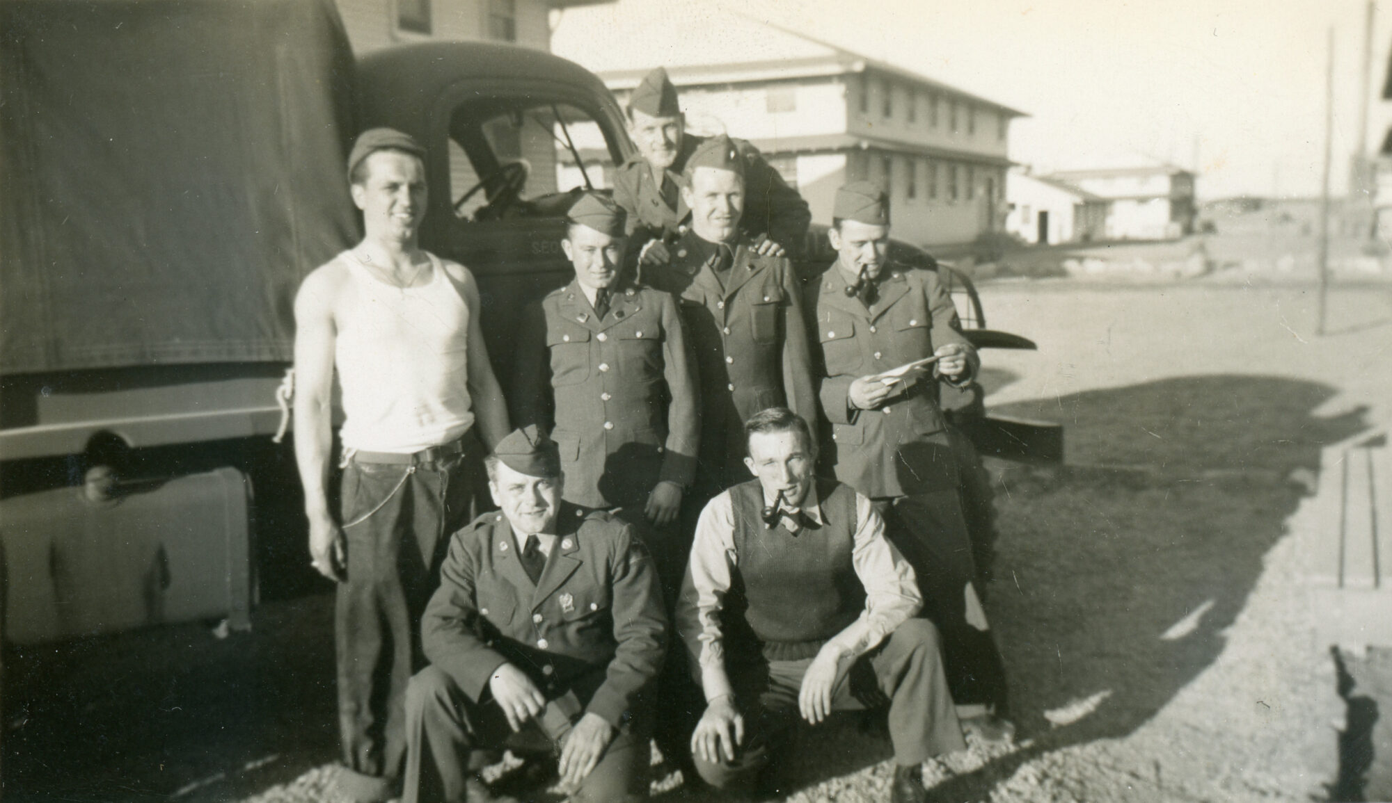 Soldiers pose in front of a truck at Pine Camp (now Fort Drum). The man in the white shirt is Rudolph Mongrandi. 1942. Jefferson County in New York State. Donated by Gayle Mongrandi.